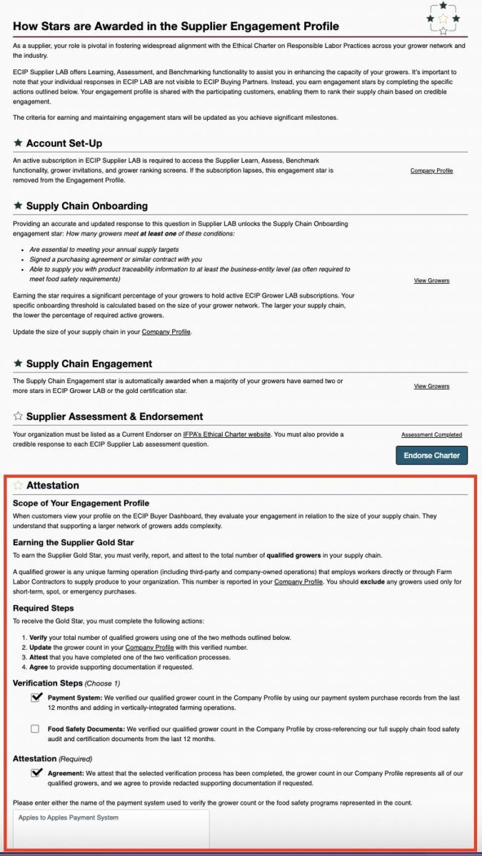 - Supplier Assessment & Endorsement: Achieved by officially endorsing the Ethical Charter through the International Fresh Produce Association (IFPA) website and completing the self-assessment of the 15 management systems within Supplier LAB.